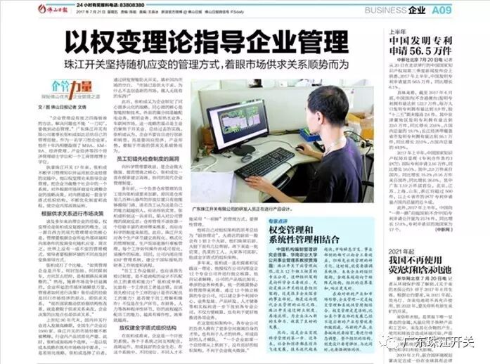 2017年7月21日,佛山日报A09版“企管力量——探秘佛山优秀企业管理之道”栏目,刊发了广东珠江开关有限公司及董事长张柏成对企业管理的专题报道。