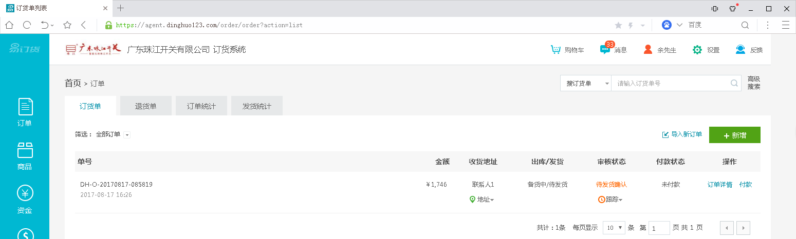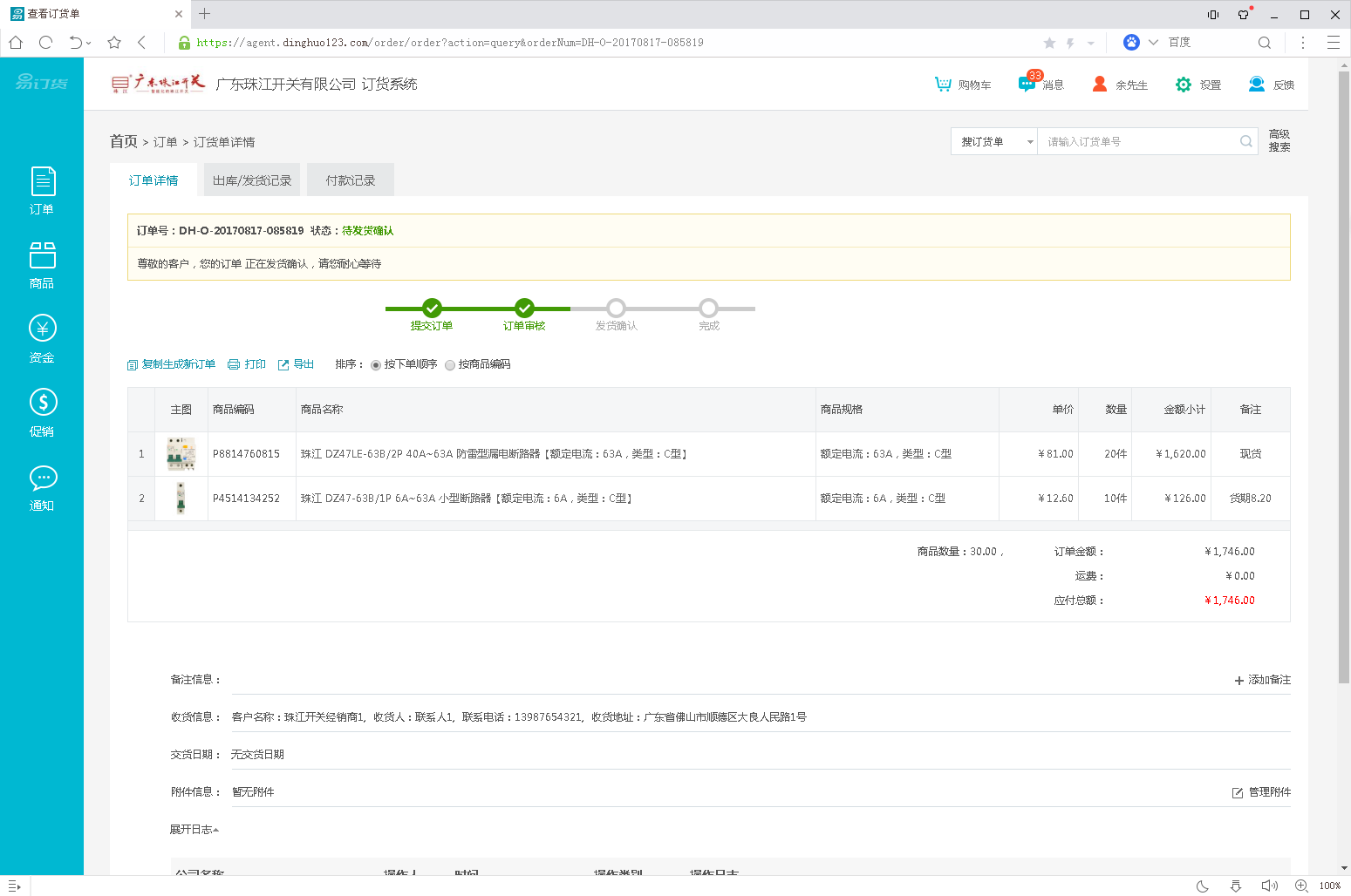 5、珠江开关接待组将按照该订单信息,通知经销商付款,确认货款到帐后进行产品出货操作