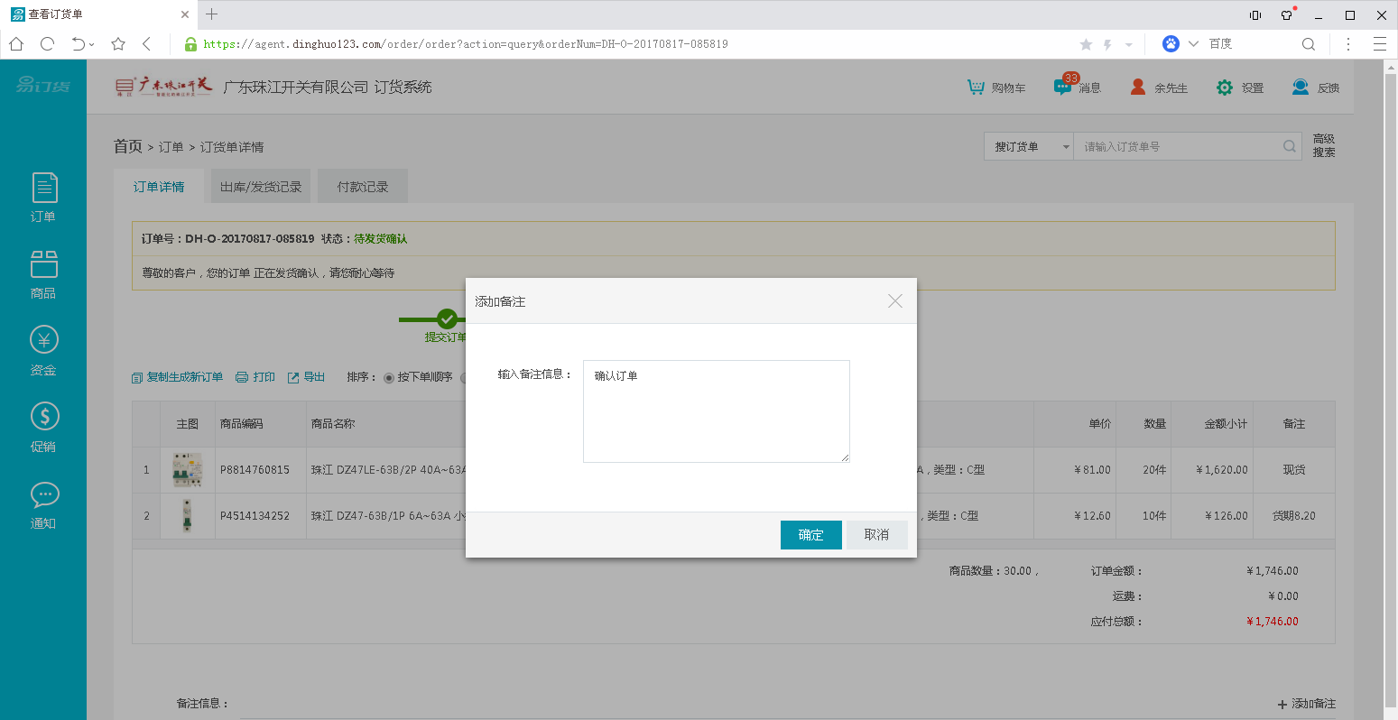 3、核对无误后,确认订单:订单中部点击“添加备注”,输入“确认订单”并确定