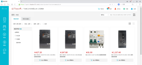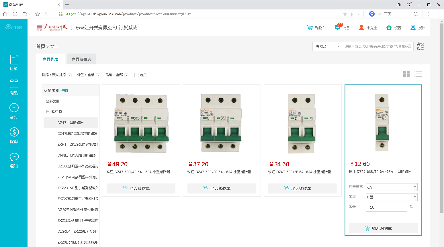 2、点击左侧第二栏“商品类别”下面的“珠江牌”,展开产品类别菜单,再点击“DZ47小型断路器”,进入对应的产品列表
