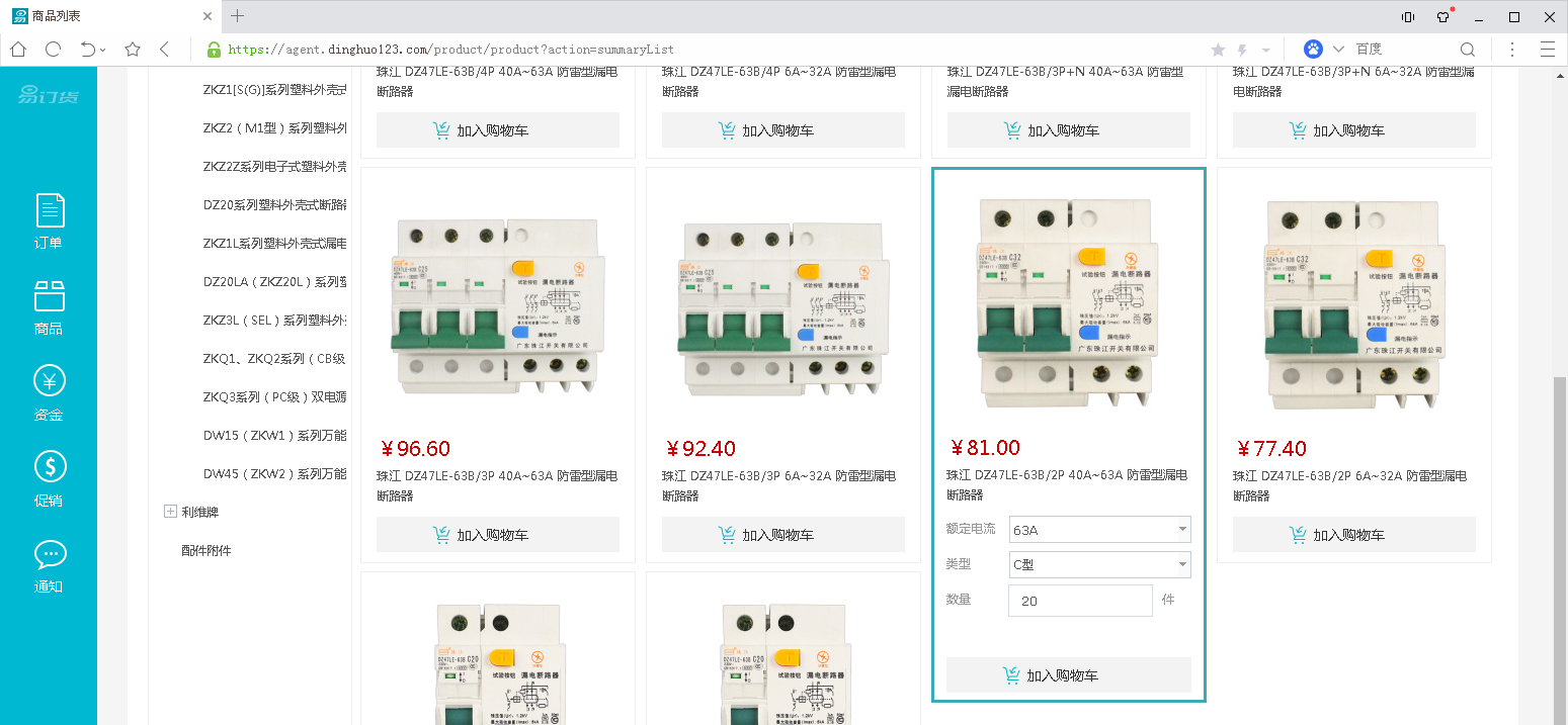 5、鼠标放在“DZ47LE-63 2P”产品上,在方框内,选择“63A,C型”,数量输入“20”,点击“加入购物车”
