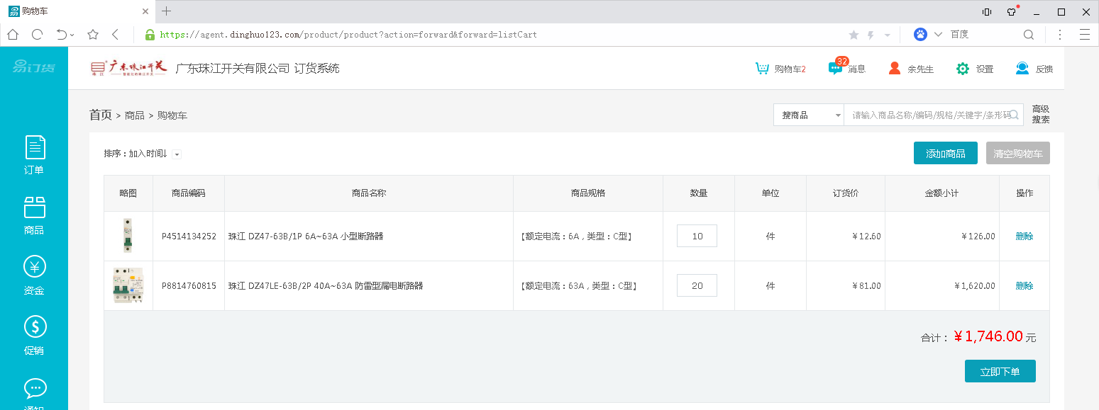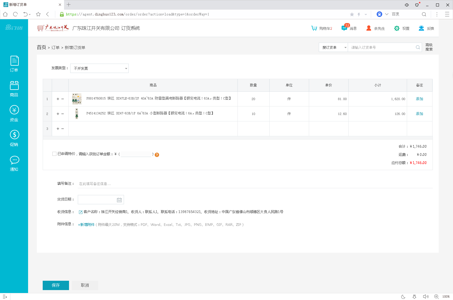 二、下单订货(订购: 珠江DZ47-63 1P 6A,10个;珠江DZ47LE-63 2P 63A防雷,20个)