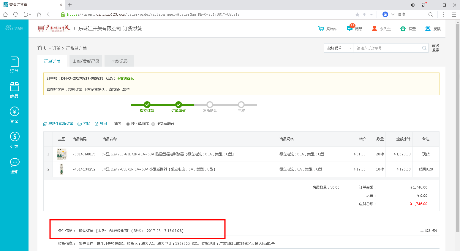 5、珠江开关接待组将按照该订单信息,通知经销商付款,确认货款到帐后进行产品出货操作